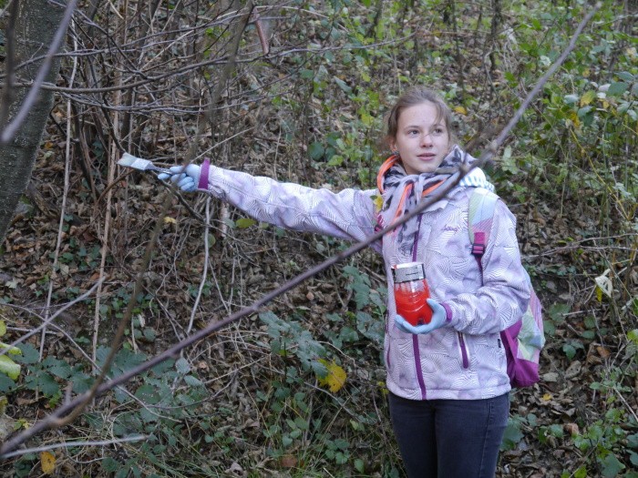 Stretli sme sa o 8:00 pred klubovňou, niektorí síce trošku meškali, ale stihli sme to. Išli sme spolu na autobus č. 88 na Mlynské Nivy a stadiaľ autobusom do Borinky. V autobuse bola tlačenica a boli tam s nami aj iní skauti. Keď sme v Borinke vystúpili, prešli sme kúsok k parkovisku, kde nás čakal Teo. Dal nám farby a rukavice a išli sme robiť značky na stromy, aby sme označili hranice chránenej oblasti. Na začiatku bola hrozná zima a veľmi fúkalo, ale keď sme išli hlbšie do lesa, bolo nám už teplejšie. Bola tam nádherná príroda. Keď zafúkal vietor, listy lietali po celom lese. Škrečok sa to pokúšal nakamerovať J.