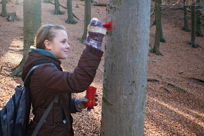 Najprv prvý strom nafarbila Gabča spolu s Teom. Potom sme sa už porozdeľovali na skupinky a farbili sme značky. Keď som išla maľovať ja, bola som taká šikovná, že som si ofŕkala vetrovku. Keďže som túto vetrovku nosila do školy, Šimon (môj brat) mi povedal, že keď to chcem ešte nosiť, tak to musíme rýchlo vyčistiť. Otvoril „ŘÍDIDLO“ a vyčistil mi to. Ale to smrdí! Bŕŕ!